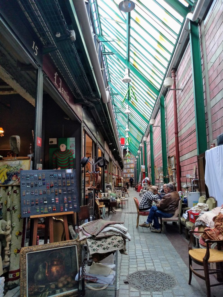 We walk through the park, with it rolling slopes, to the nearby metro station, Gard d’Est. It is a straight run to Porte de Clingencourt, and a handy sign saying “Puce” (meaning “flea” directs us). We are heading for a flea market.