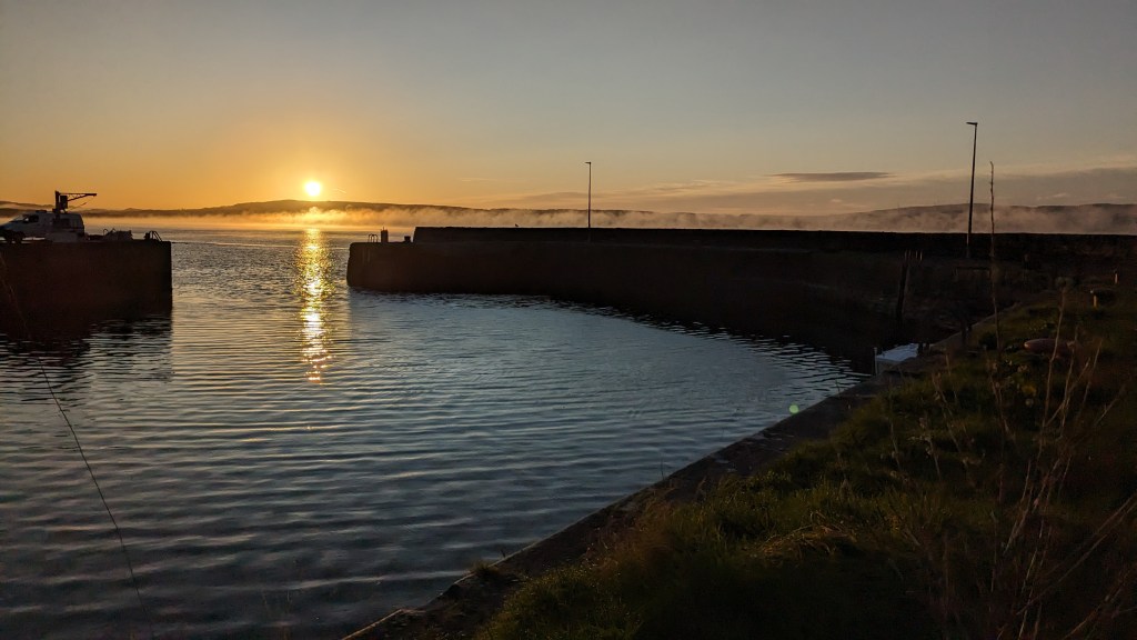 On this bright morning it seems we have the world to ourselves. We stop at a small harbour to watch a beautiful golden dawn slip over the countryside and the water.