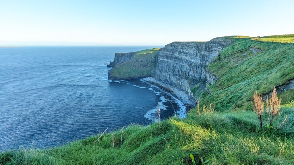 FOOTNOTE: We got to the cliffs just after dawn, and yes it was amazing. As I drove away, I wondered what the Cliffs looked like at sunset? At dawn, the light was behind us. At dusk, the sun would be setting into the ocean and the layers of the cliffs would have been more apparent. It might have looked spectacular?
