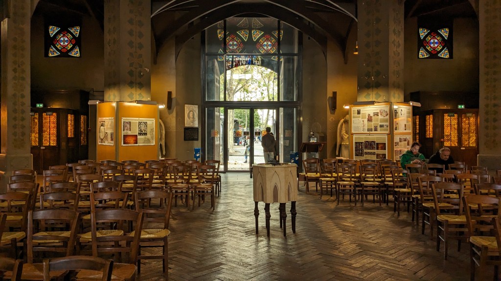 We found our way to Saint-Jean de Montmartre is a Roman Catholic parish church located at 19 Rue des Abbesses in the 18th arrondissement of Paris. It was built from 1894 to 1904 and is a good place to rest our feet.