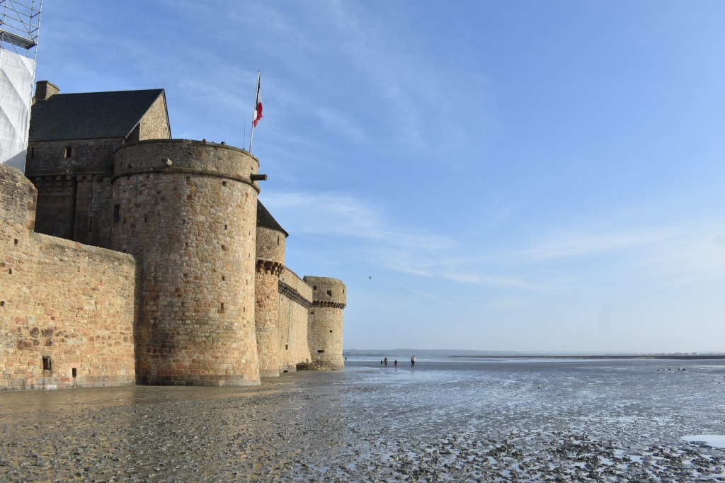 We had indeed picked a great day – weatherwise – for our visit. From the drop-off point, just before the island, we snapped photos of Mt Saint Michel under a pale blue sky at low tide.